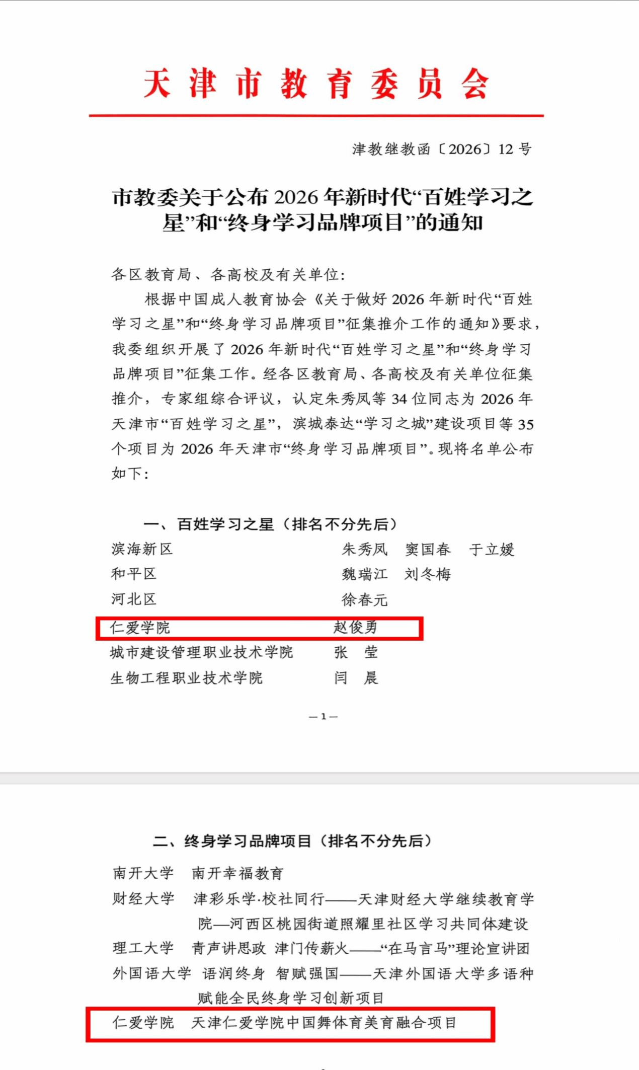 近日,天津市教委公布了2026年新时代“百姓学习之星”和“终身学习品牌项目”名单。我校教师赵俊勇荣获“百姓学习之星”称号;体育学院《天津仁爱学院中国舞体育美育融合项目》成功入选“终身学习品牌项目”。