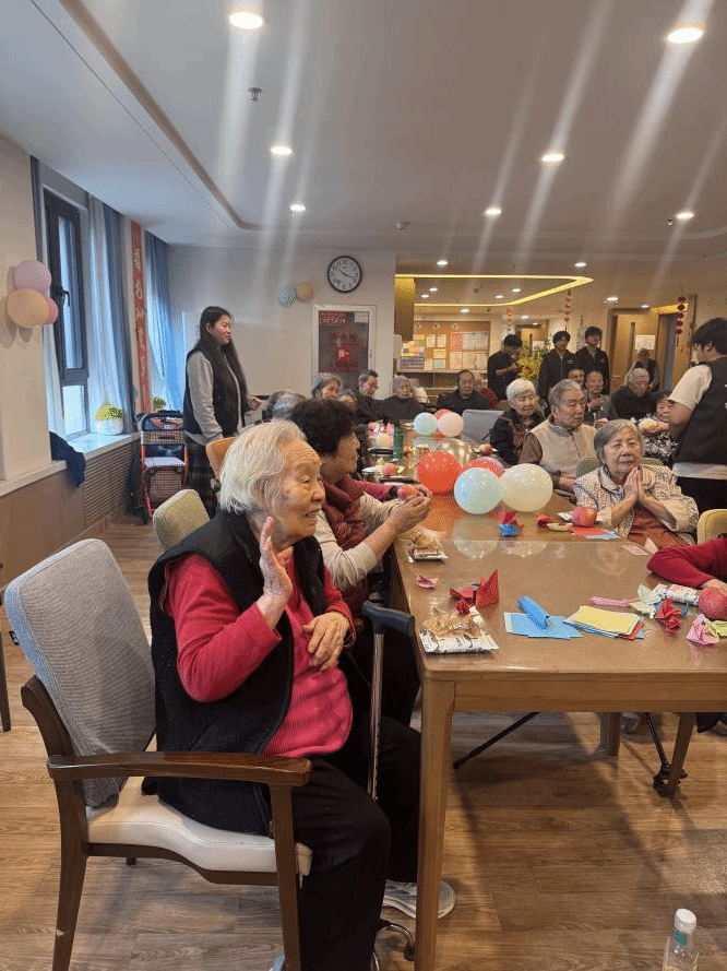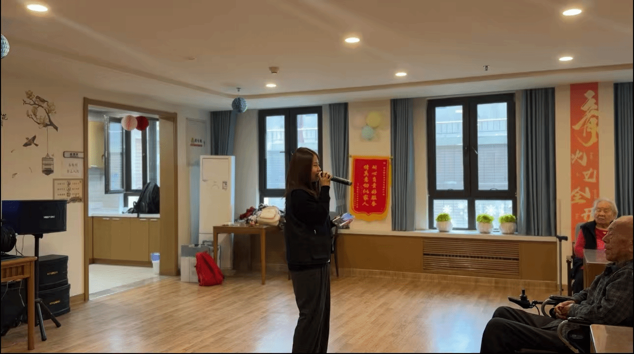 活动现场暖意融融,欢声笑语不绝,书香与歌声交织,服务与爱心同行。社团同学化身温暖的“朗读者”与“陪伴者”,为长者们带来了丰富多彩的节目与贴心服务:同学们声情并茂地朗诵了精选诗歌与散文,用清澈的嗓音,为长者们打开一扇通往文学世界的窗;大家围坐于长者身旁,一对一读报、讲述书中趣闻,文字在指尖流淌,化作耳畔熟悉的乡音,绘就一幅幅温馨画面;熟悉的经典老歌旋律响起,同学们与长者共同合唱,歌声中有他们的青春记忆,也有我们由衷的敬意;同学们还协助工作人员整理内务、分发茶点,以细致入微的行动传递着浓浓的敬老情意。值得一提的是,为提升活动内涵,图书馆老师特别准备了阅读推荐:书籍《我们仨》文字平和温暖,充满对亲情与人生的感悟,极易引发长者共鸣;诗歌《当你老了》意境优美深沉,表达出对生命与长者的恒久敬意,由青春的声音诵读,更形成跨越时空的动人呼应。