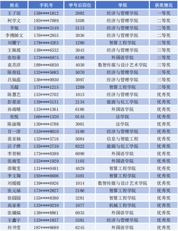 本次大赛分为个人知识竞赛和团体研究报告两个赛段。在个人赛阶段,吸引了来自41所本科及高职高专院校的5469名选手踊跃参与。我校共有226名学生参赛,我校学子获一等奖1人,二等奖3人,三等奖6人,优秀奖20人,并以优异的总分成绩进入晋级团体赛(全市仅12所高校入围)。