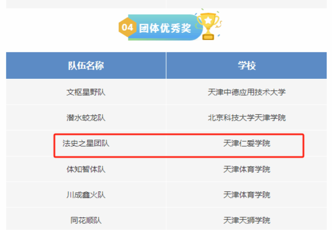 决赛为团队赛,共有12所院校的18支3人组队团队参与决赛。根据团体赛规则,我校组建了两支参赛队伍——“溯泱之翼”和“法史之星团队”,每队由3名队员和1名指导教师组成。经过激烈角逐,我校由袁苏洋(数智传媒与设计艺术学院 2023级)、林子涵(数智传媒与设计艺术学院 2023级)、徐鑫远(机械与动力工程学院 2024级)组成的“溯泱之翼”获得团体三等奖,由李昕颐(法学院 2024级)、高子宇(法学院 2024级)、王琢玉(法学院 2021级)组成的“法史之星团队”获得团体优秀奖,与此同时,天津仁爱学院图书馆获得优秀组织奖,图书馆馆员魏巧玲获得指导教师奖。