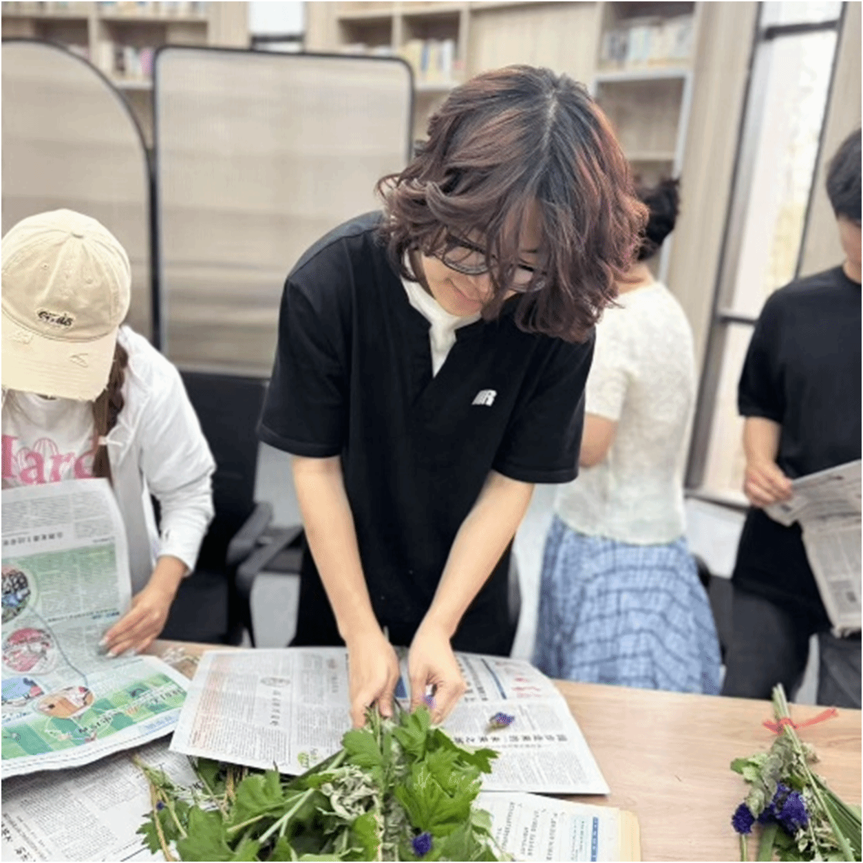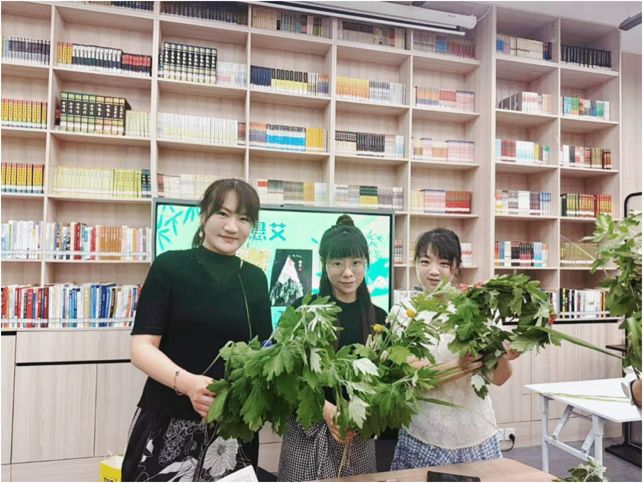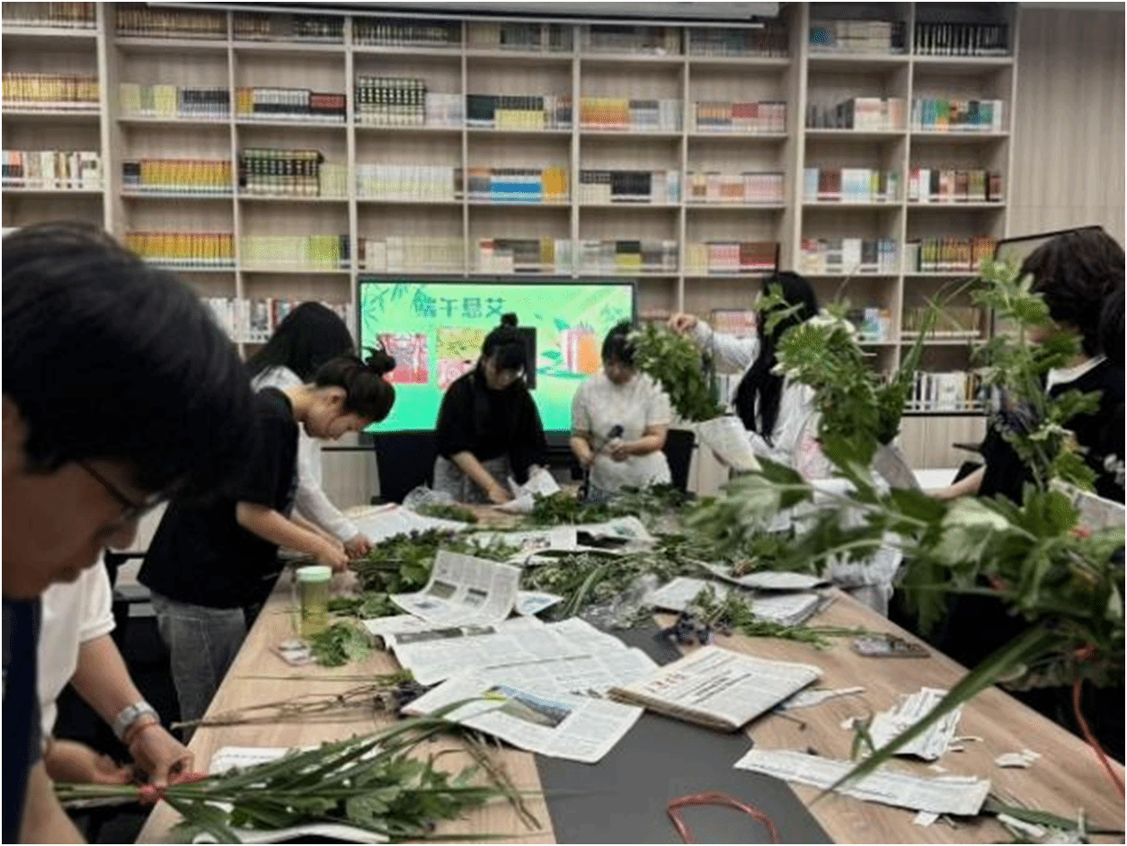 活动现场布置得古色古香,工作人员提前准备了新鲜的艾草、五彩丝线、报纸等材料。张老师首先为大家讲解了端午悬艾的历史渊源和文化内涵,随后手把手教授艾草香囊的制作方法。