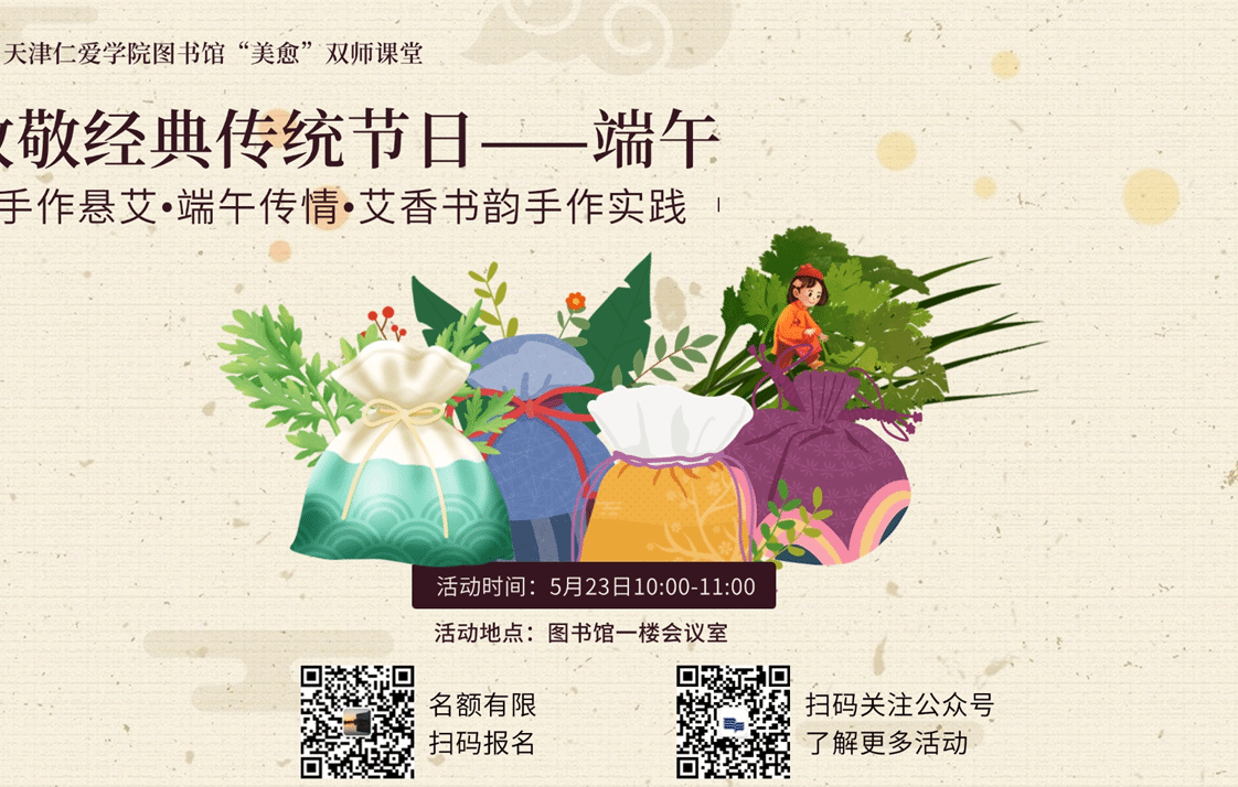 为弘扬中华优秀传统文化,深化美育与疗愈的“双师”融合实践,天津仁爱学院图书馆非遗匠心手作社指导教师王珊联合阅读疗法基地指导教师张欣琪两位老师特别策划"手作悬艾·端午传情·艾香书韵"主题实践活动。活动于2025年5月23日上午10:00在图书馆会议室举办,由指导老师讲述端午节悬艾的历史。