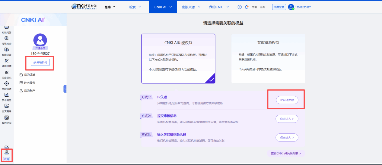 输入网址:www.cnki.net,选择CNKI AI进入,进入左下方个人页面,选择关联机构,在学校IP范围内选择IP关联即可使用。