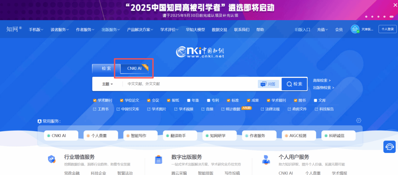 为辅助学校在人工智能(AI)领域的深化工作,推动AI技术在教学、科研及服务管理中的广泛应用, 经与中国知网深入沟通,我馆再次开通CNKI AI的试用,请大家积极使用并给予反馈!